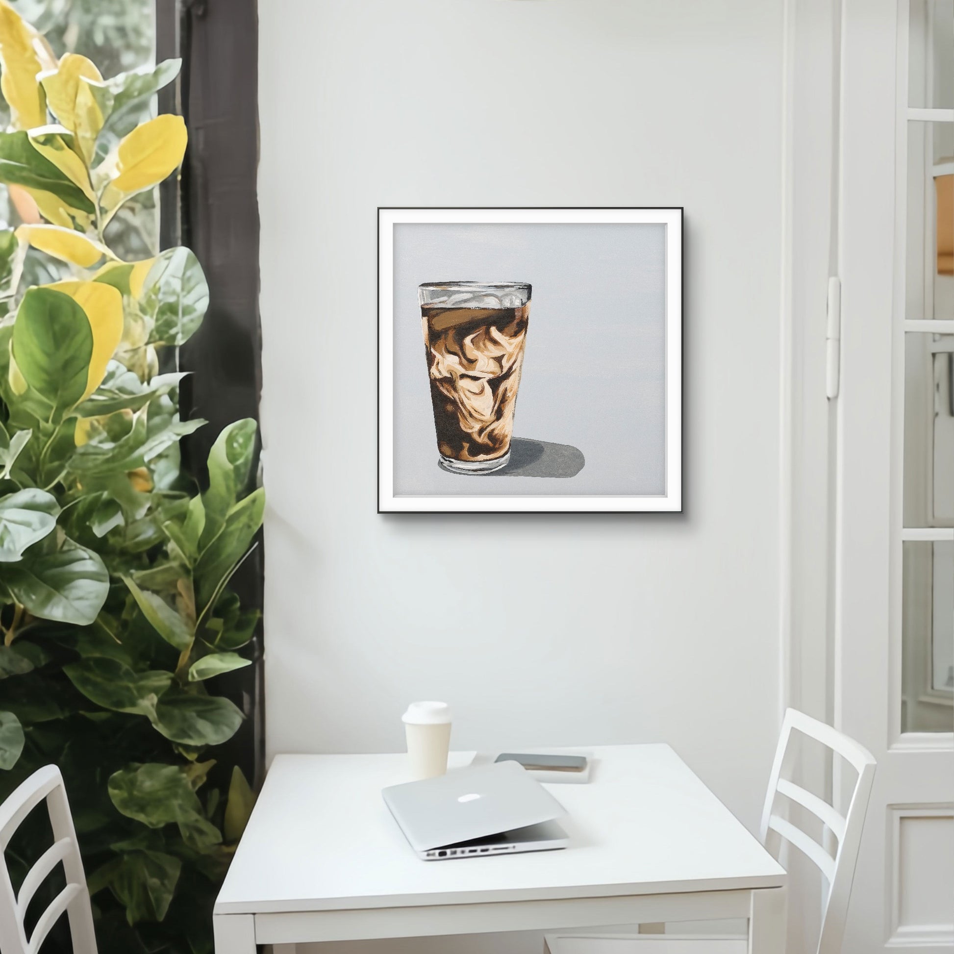 Upgrade your walls with Iced Coffee, portraying swirls of rich coffee and creamy goodness. Ideal choice for kitchens, coffee nooks, or any space in need of a caffeinated visual boost. Featuring a clear glass filled with iced coffee as the cream is swirling in on a gray/blue background.