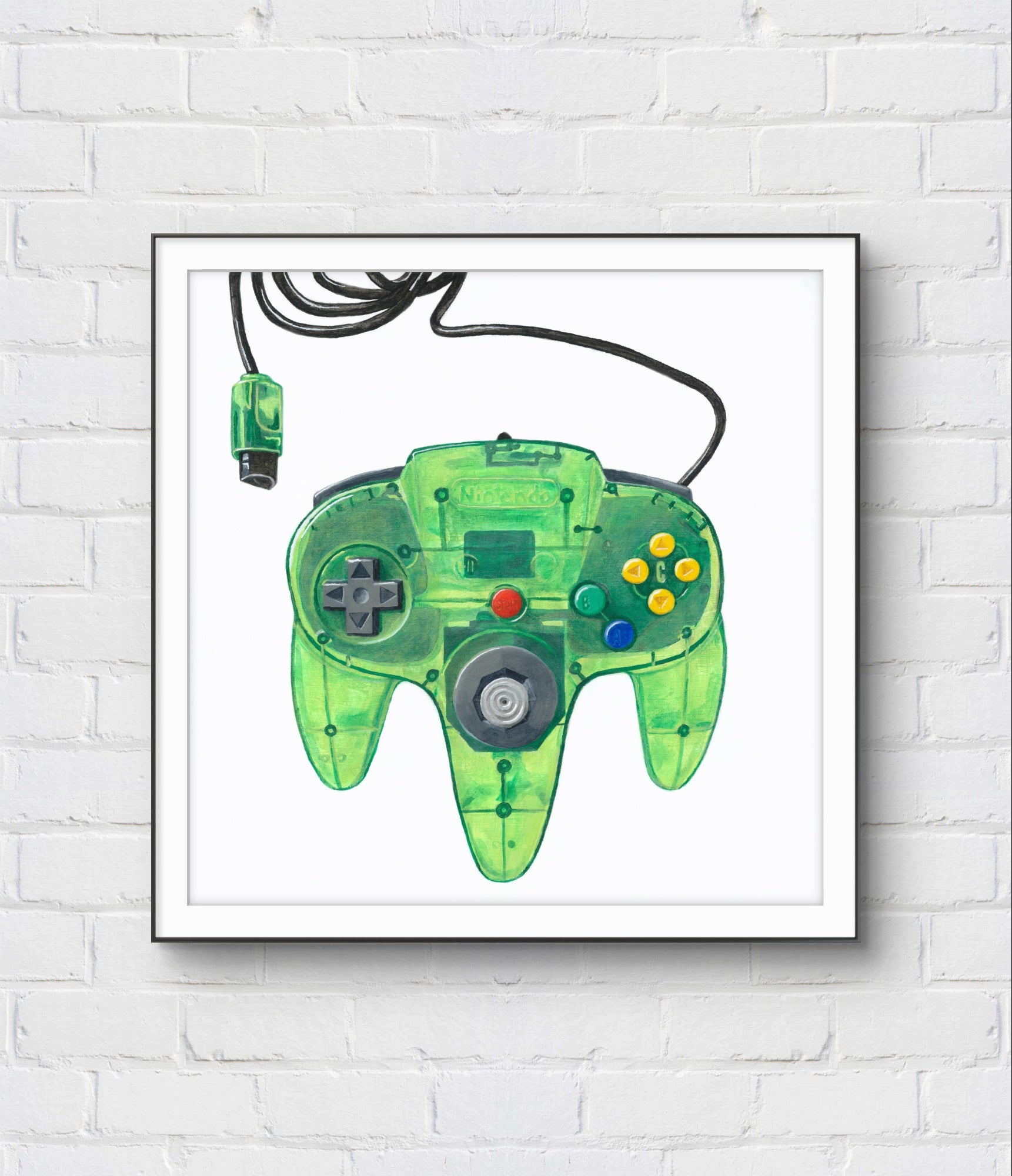 N64 is a colorful nod to the fun of childhood, while depicting the intricacies of the translucent green limited edition Nintendo 64 controller. It captures the timeless joy of Saturday mornings spent beating levels, rescuing princesses, and monkeys swinging on vines.